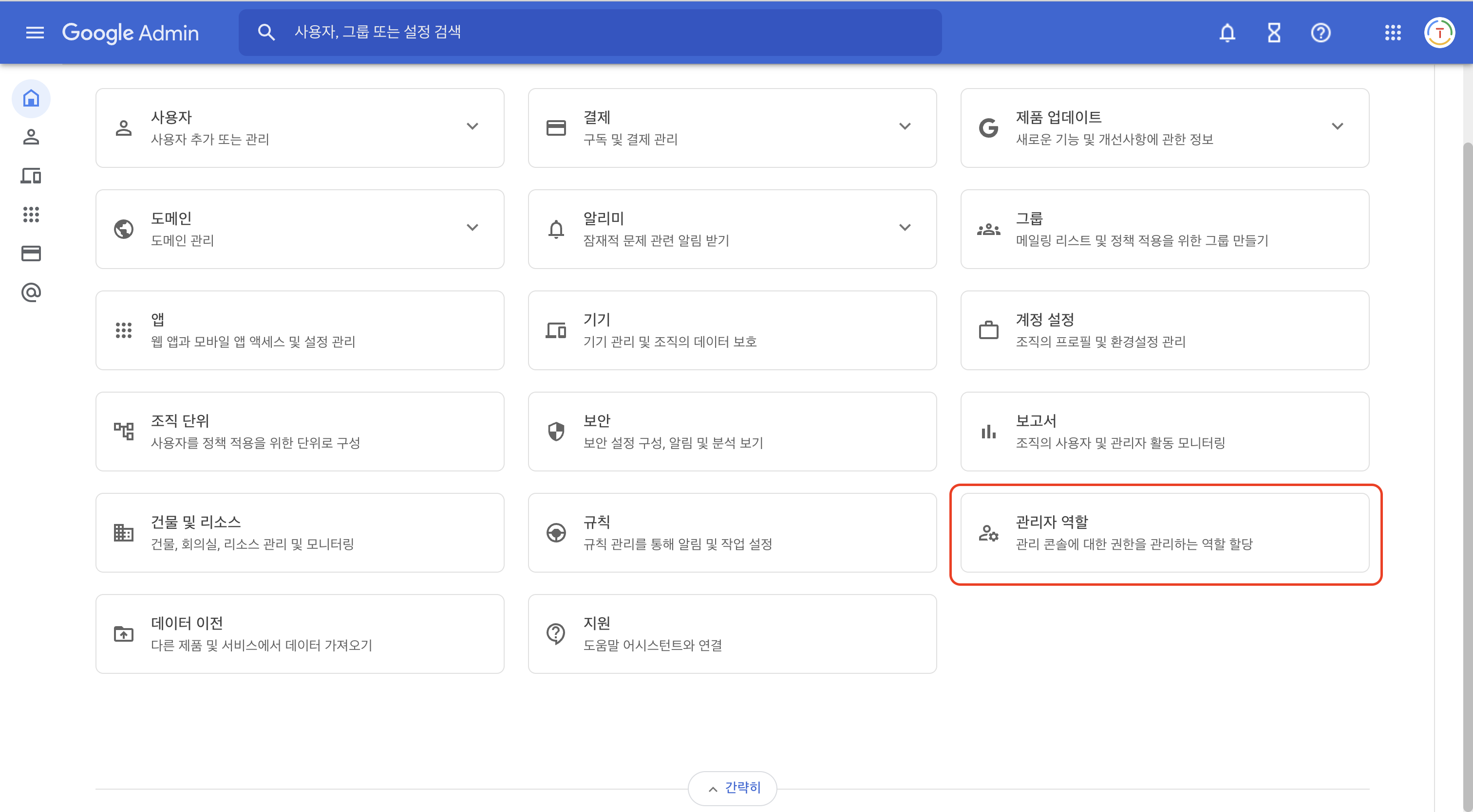 관리 콘솔 첫 화면에서 '관리자 역할' 을 클릭합니다.