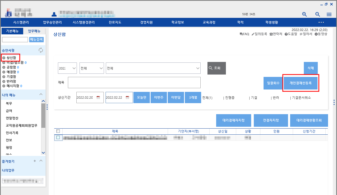 1. '기본메뉴'의 '상신함을 클릭합니다.