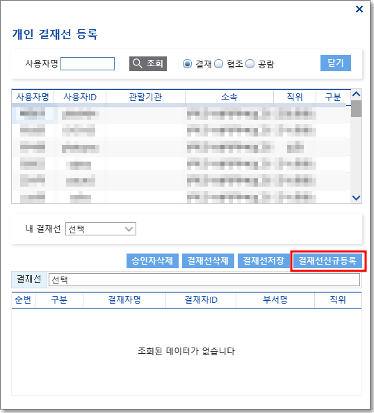 1. 개인 결재선 등록 창에서 '결재선 신규등록'을 눌러줍니다.