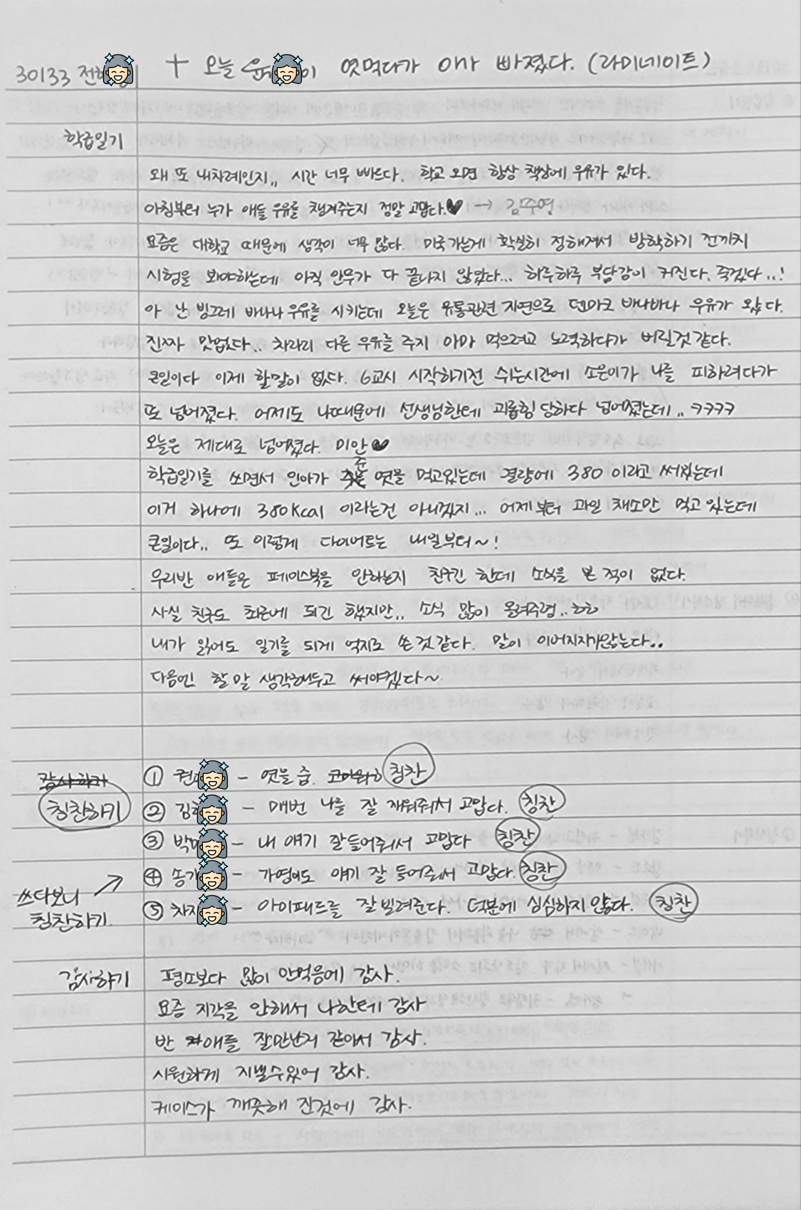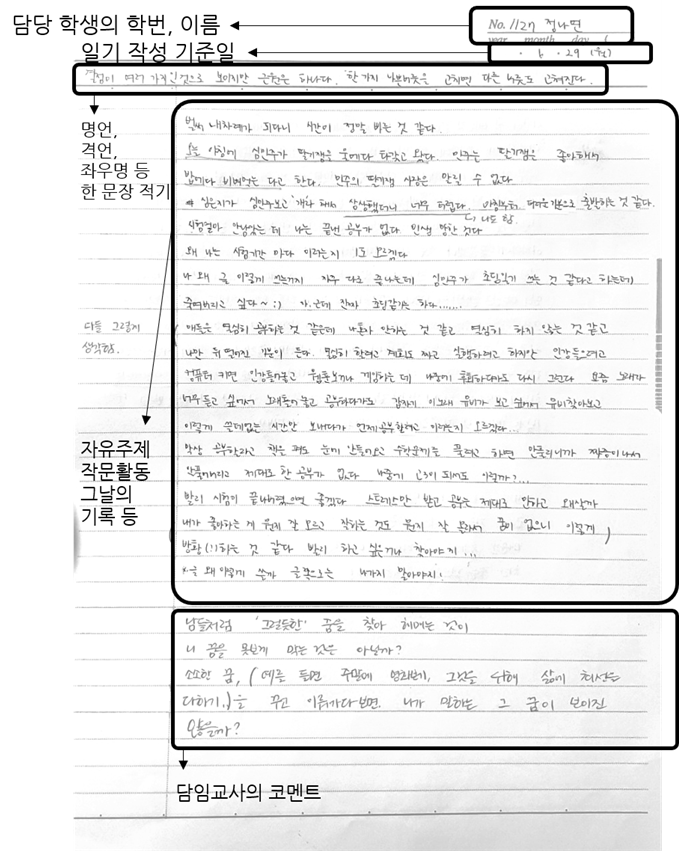- 기록하지 않는 학생들도 가끔 있지만, 주변의 성화에 못 이겨 결국 일기를 작성합니다.
