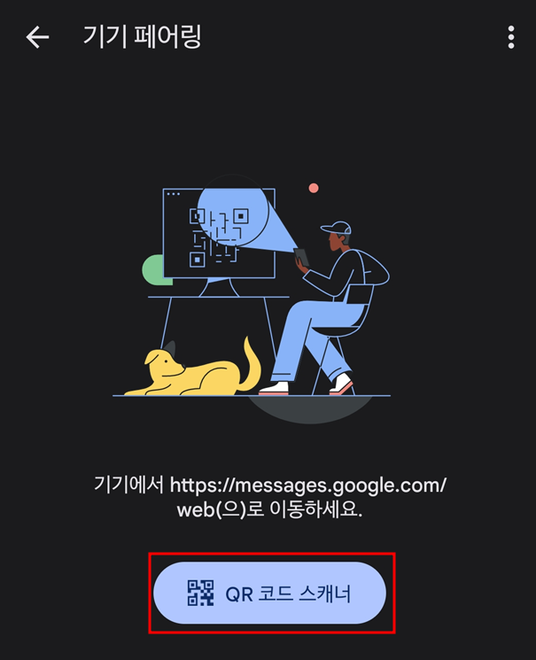 - 사이트에서 제시하는 설명대로 진행합니다.1) Google 메시지 앱 실행하기2) 점 세개 눌러서 '기기 페어링' 선택하기