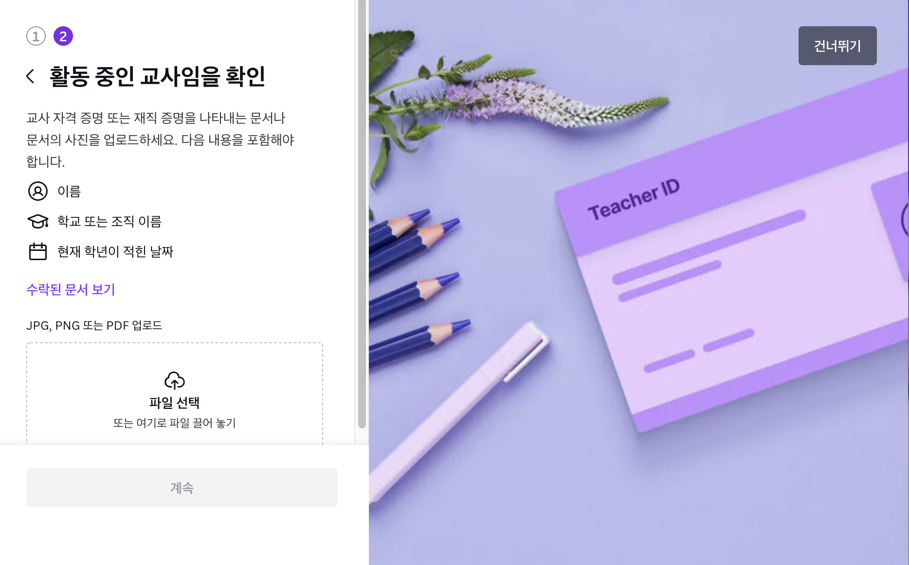 - 교사 자격 증명 또는 재직 증명을 나타내는 문서나 문서의 사진을 업로드합니다.