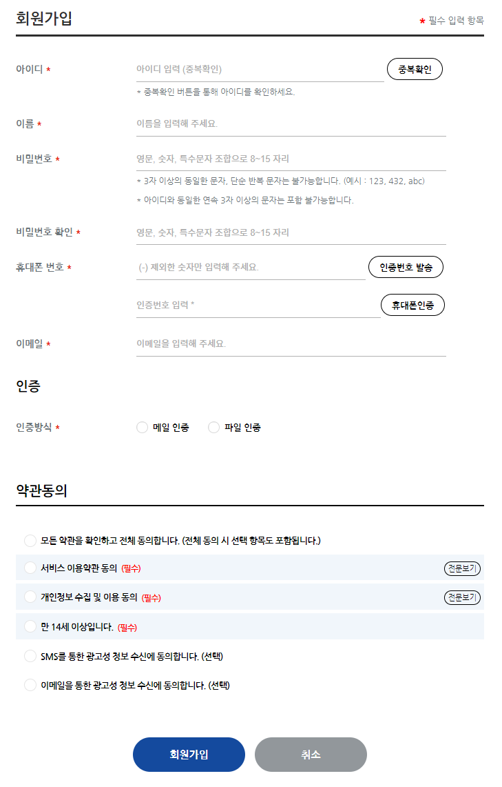 - '회원가입' 버튼을 눌러 회원가입 절차를 시작합니다.