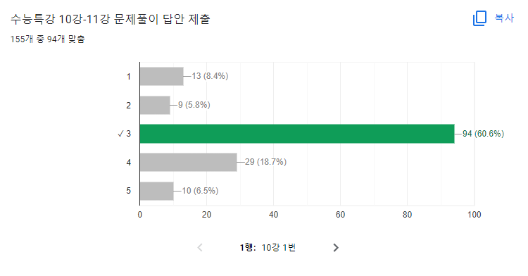 8개 학급의 1차시가 거의 마무리될 즈음에는 설문결과값이 통계자료처럼 나타나기 때문에 학생들이 실질적으로 체감하는 문항에 대한 난이도, 매력 오답 등을 실증적인 자료를 통해 확인할 수 있었습니다. 이 과정은 다음 차시에 있을 해설 강의 준비에 바로 반영이 되어 학생들이 어려워했던 문항에 조금 더 힘을 주어 강의를 준비할 수 있었습니다.