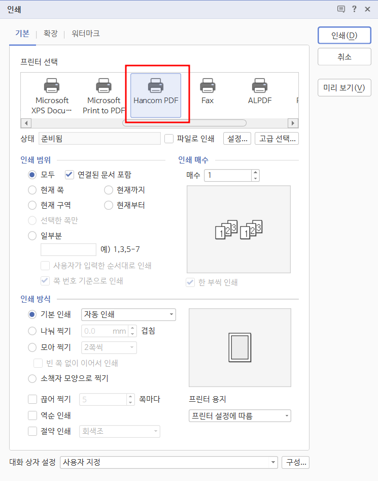 프린터 선택 중 Hancom PDF를 선택합니다.