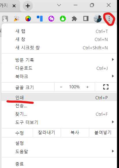 인쇄를 원하는 화면에서 Ctrl + P를 누르거나 다음 위치에서 인쇄 명령을 누릅니다.