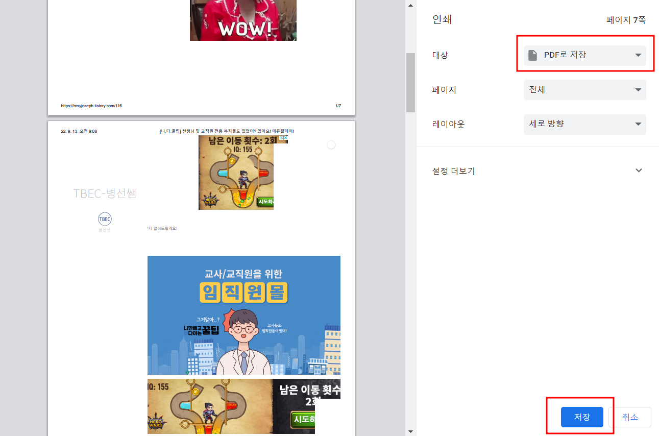 아래처럼 프린터 선택창이 출력되면, PDF로 저장을 선택 후 '저장' 버튼을 눌러줍니다.