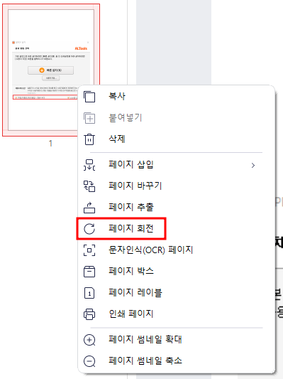 회전을 원하는 페이지를 선택 후 마우스 우클릭을 눌러봅니다.