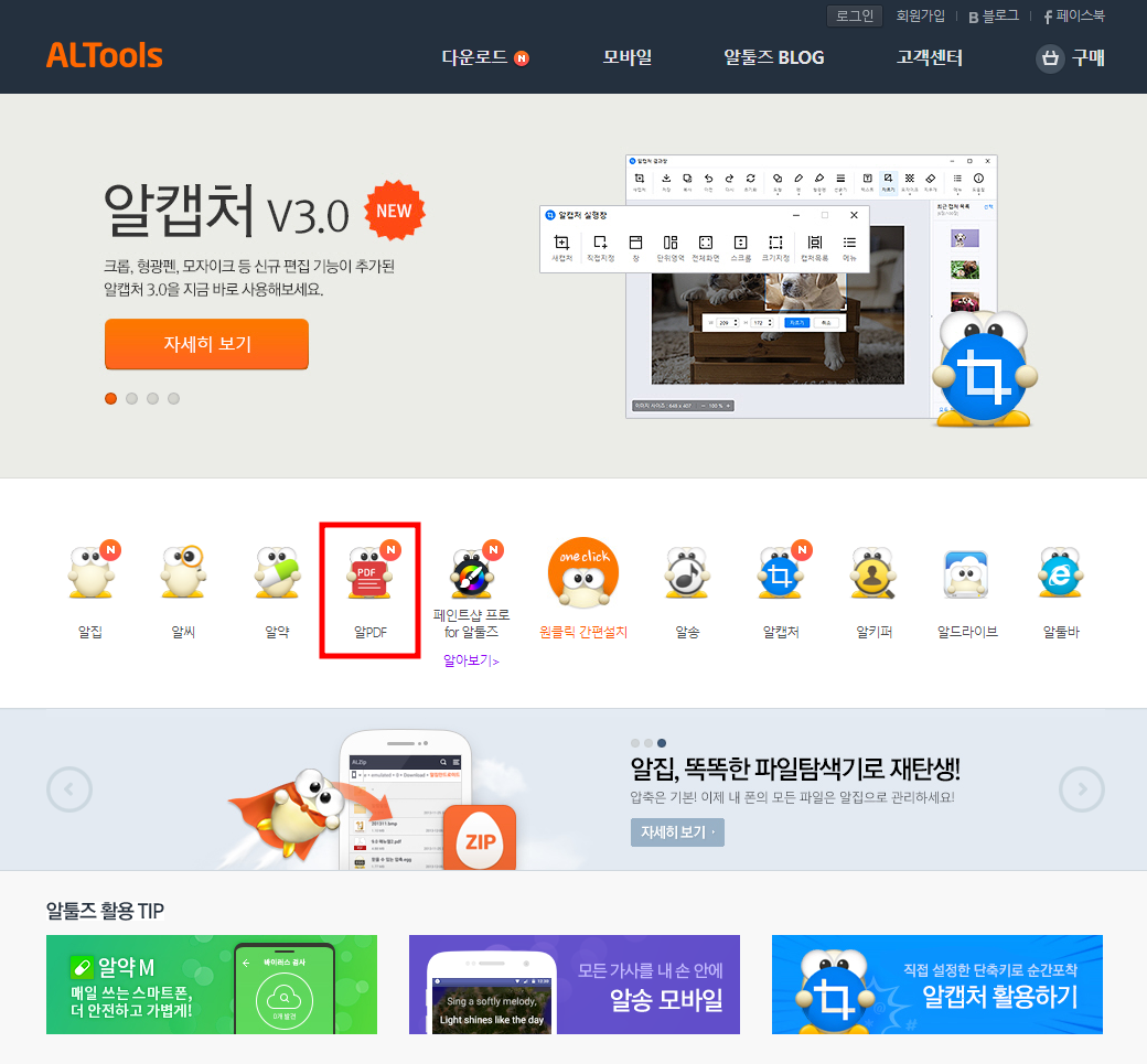 개인용 알 PDF는 알툴즈 공식 홈페이지 메인화면에서 다운로드할 수 있습니다.