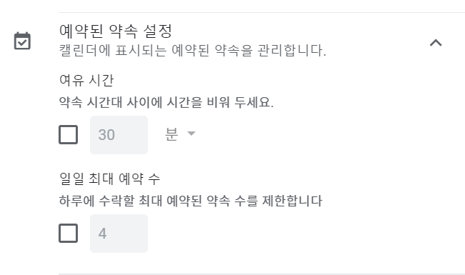 - 약속 시작 전 약속을 예약할 수 있는 최소시간을 4시간으로 설정하면, 상담일정이 임박했을 때는 예약을 받지 못할 수 있으니 체크를 해제해 줍니다.