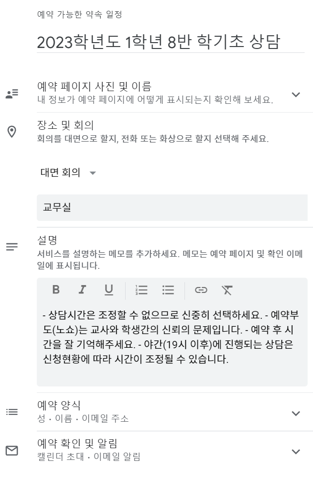 Google Workspace 계정에서 제공하는 '약속 일정' 기능에 대해 학교현장의 시나리오로 한번 적용해 봤습니다.