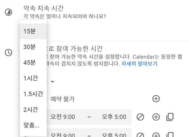 - 사전에 예약을 만들 수 있는 시간대에 제한을 둘 수 있습니다.