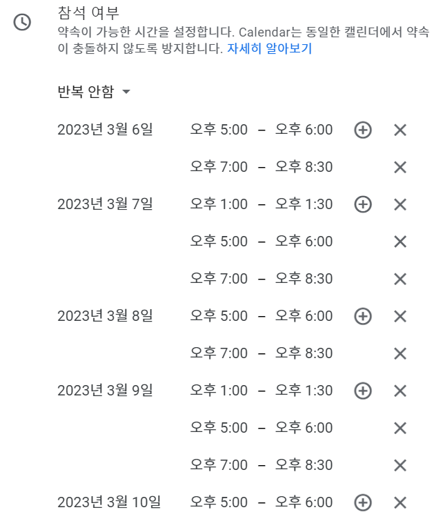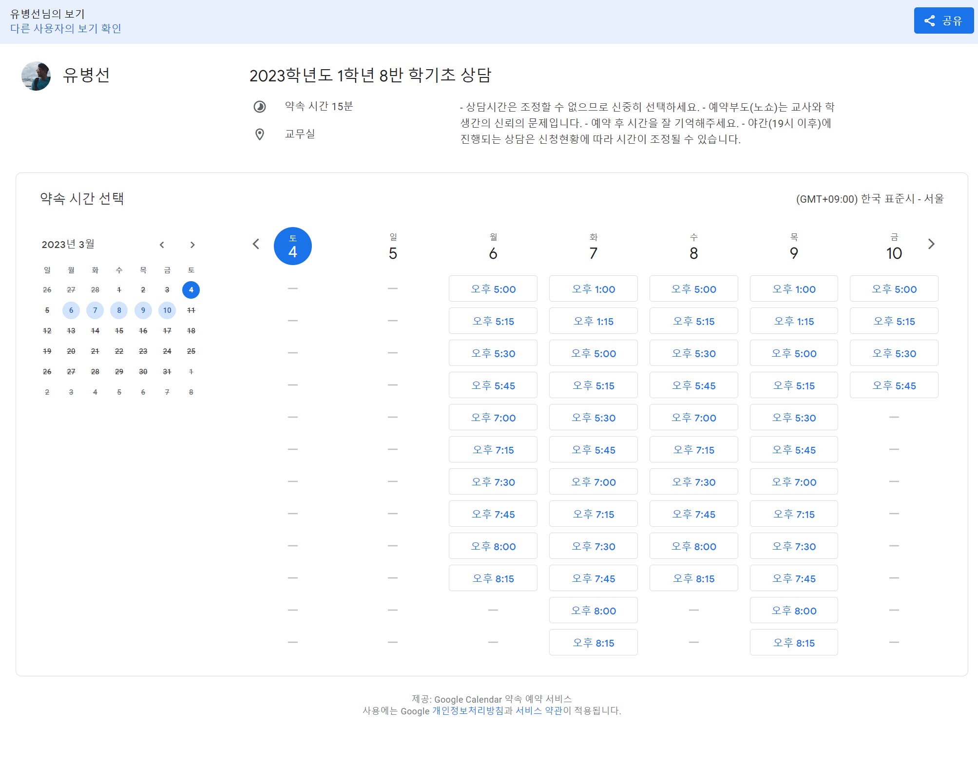 학생 상담에도 이 기능이 가능하겠지만, 학부모 상담 때도 이 기능을 활용하면 스마트하게 일정을 잡을 수 있겠지요?