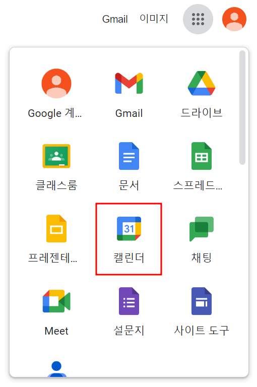 위의 링크를 클릭하거나 구글 첫 화면에서 보이는 와플 모양을 눌러 아래에 출력되는 캘린더를 눌러 입장합니다.