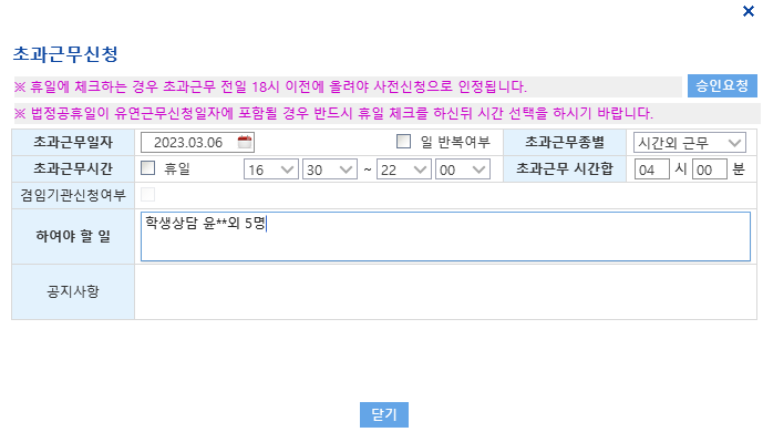 3. 초과근무 시간과 해야 하는 일을 간략히 입력합니다.
