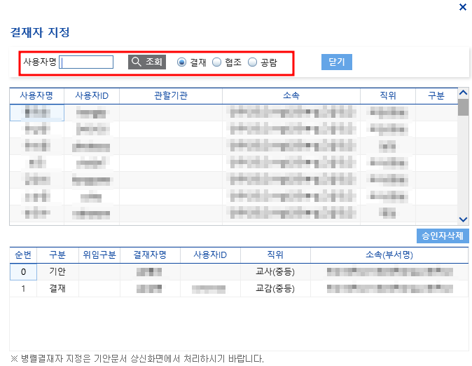 - 검색 후 이름을 더블클릭하면 결재경로에 설정이 됩니다.