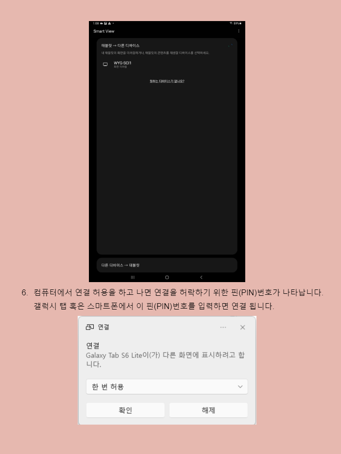 - 이제 갤럭시 탭이나 스마트폰에서 스마트뷰(Smart View)를 실행시킵니다. 동일 네트워크에 있는 연결 가능한 디바이스 목록이 나타납니다. 미러링할 디바이스를 클릭합니다.