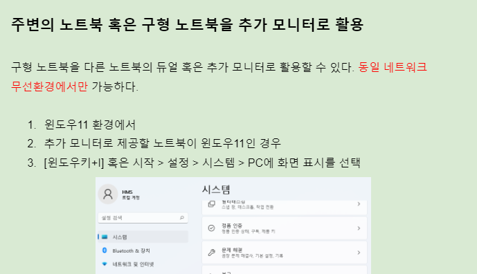 주변의 노트북 혹은 구형 노트북을 추가 모니터로 활용 구형 노트북을 다른 노트북의 듀얼 혹은 추가 모니터로 활용할 수 있다. 동일 네트워크 무선환경에서만 가능하다. 윈도우11 환경에서 추