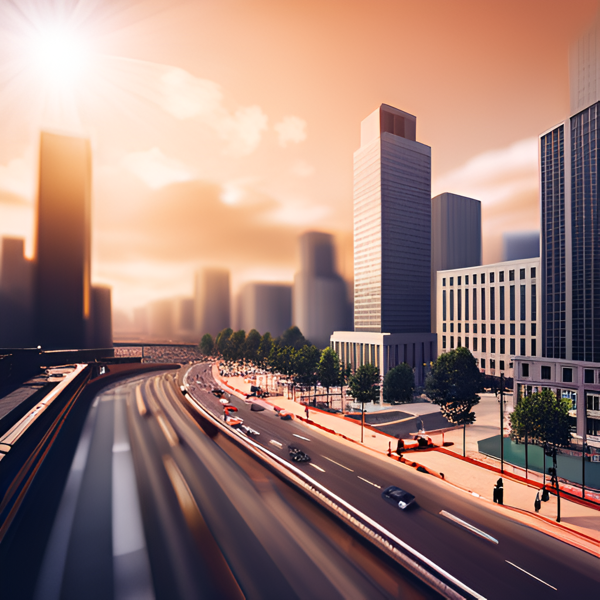 산책로, 차량, 엘리베이터, 사람, 나무, 실외, 건물, 풍경, 하늘, 건물 외관, 자동차, 교통, 주차, 도로 그려줘.