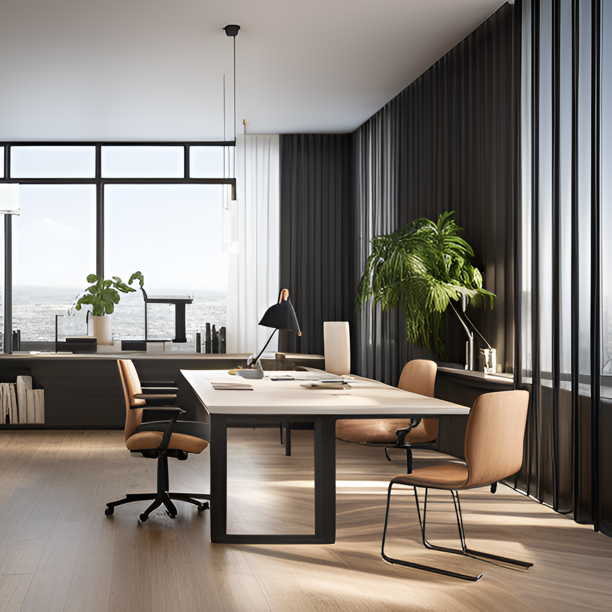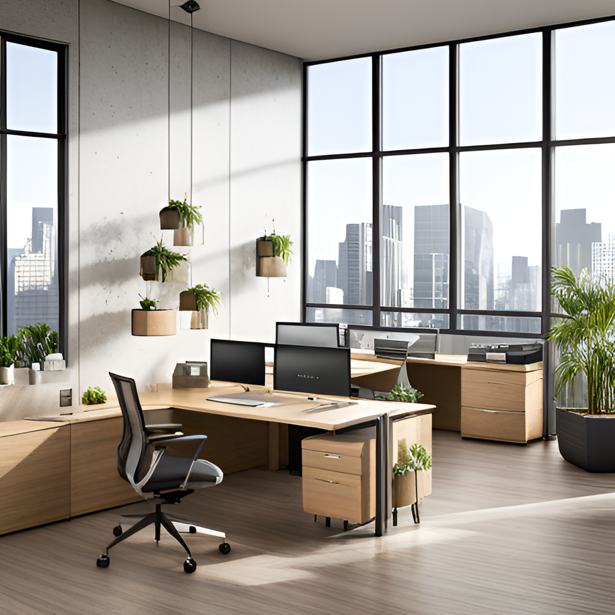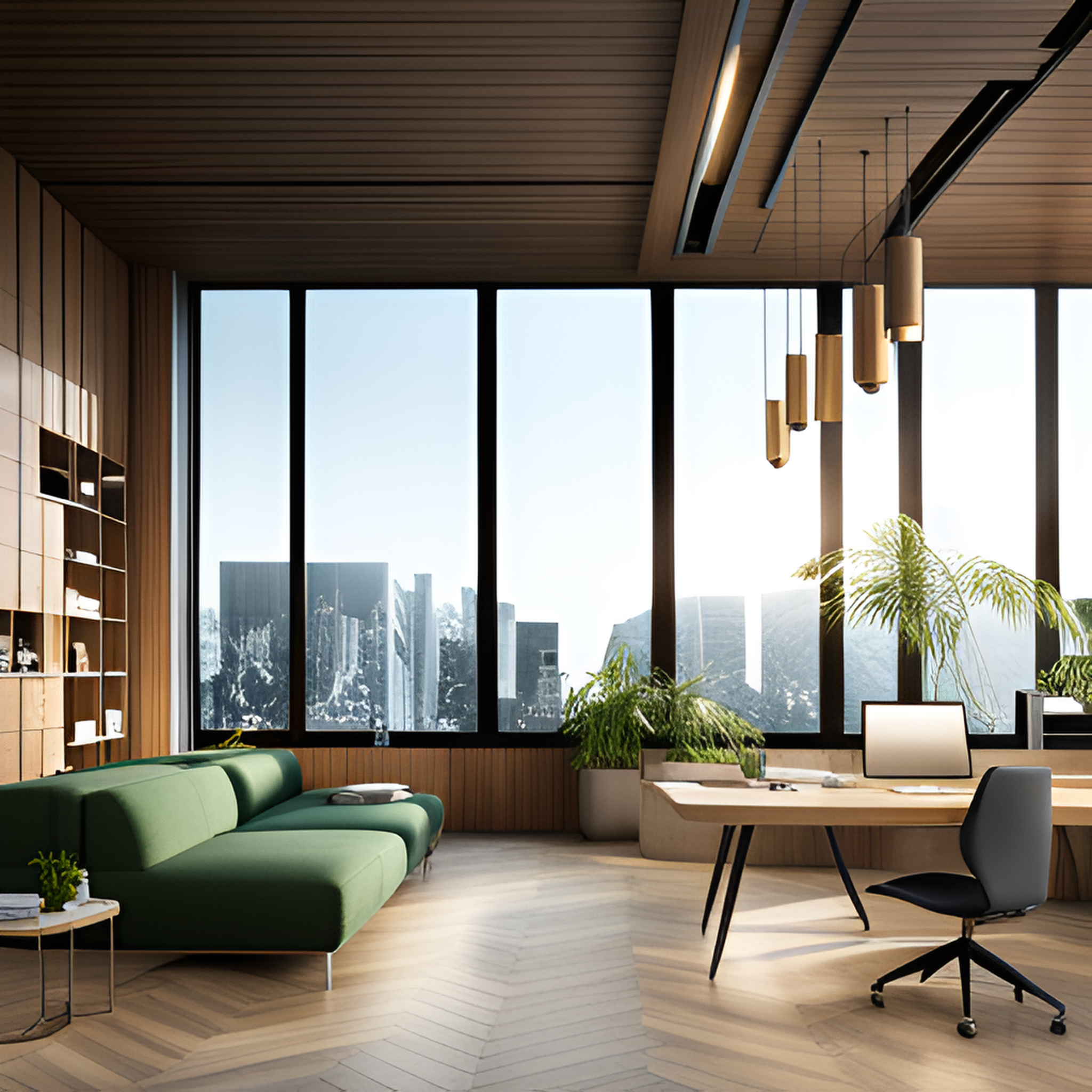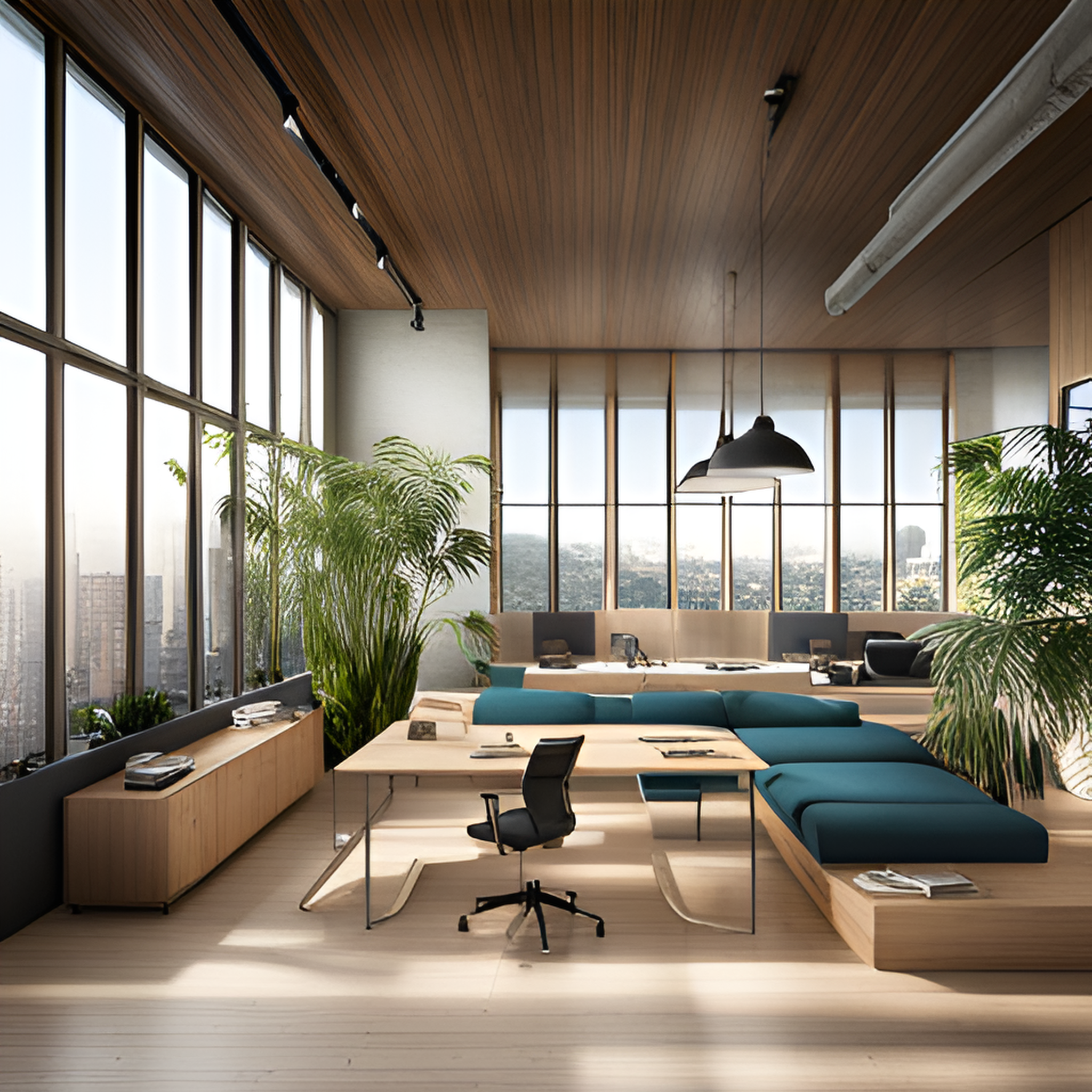 넓은 공간 자연 채광 최신 기술 편안한 의자 조용한 환경 식물이 있는 휴식 공간 친환경 인테리어 창문으로 바라보이는 탁트인 전망 개별 작업실 공동 작업 공간 그려줘