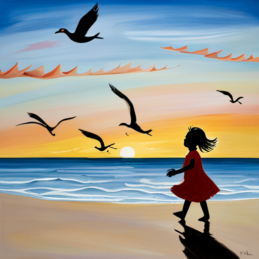 A bittersweet moment of a 30-month-old daughter, playing alone on a sandy beach at sunset, seagulls soaring in the sky, waves gently kissing the shore, and the distant sound of laughter from other children, evoking a sense of freedom and solitude, Artwork, mixed media on canvas