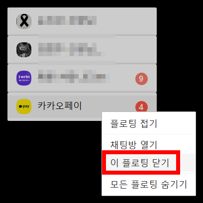 이미 설정되어 있던 플로팅에서 마우스 우클릭을 해봅니다.이후, '이 플로팅 닫기'를 눌러 플로팅을 닫아줍니다.