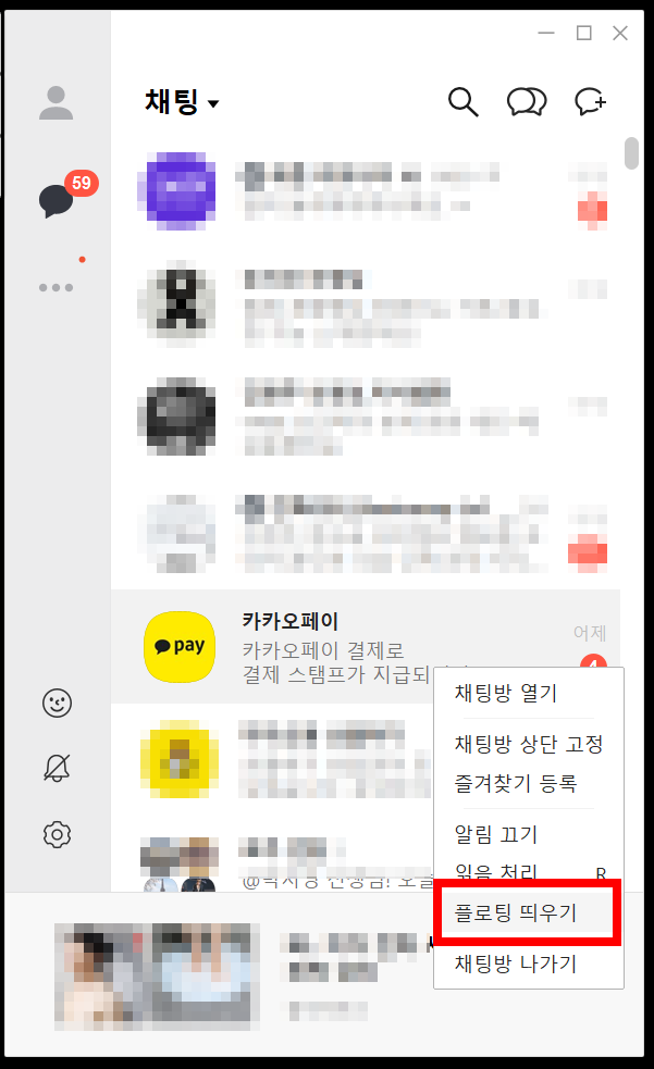 그러면 설정하려고 했던 채팅창이 카카오톡 창 밖으로 나와 플로팅 설정이 완료됩니다.