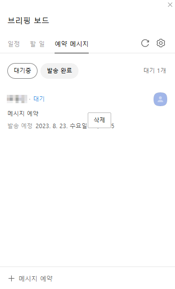 4) 예약메시지를 취소할 때는 예약된 메시지에서 마우스를 우클릭하면 나타나는 '삭제' 버튼을 눌러 삭제할 수 있습니다.