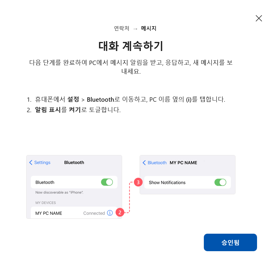 PC에서 메시지를 보내려면 스마트폰에서 '권한설정'이 필요합니다.