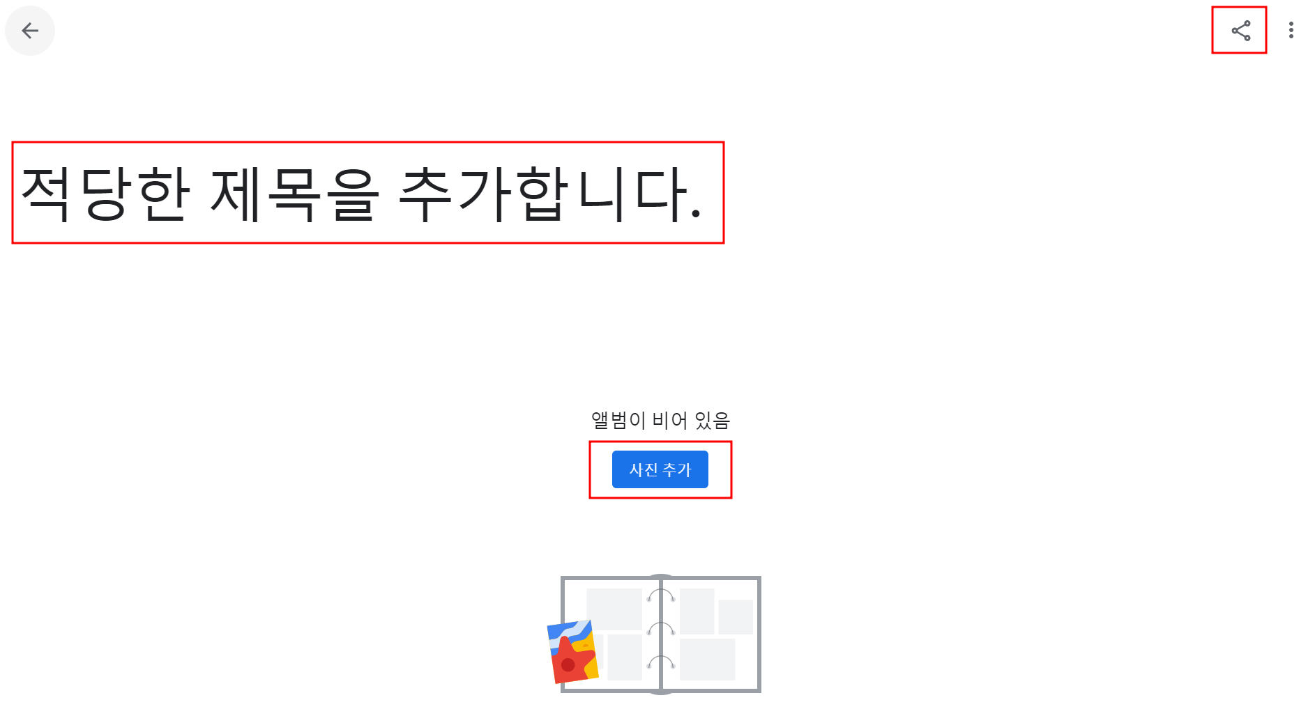 라. 앨범의 제목을 만듭니다. 적당한 사진을 추가 후 공유버튼을 누릅니다.