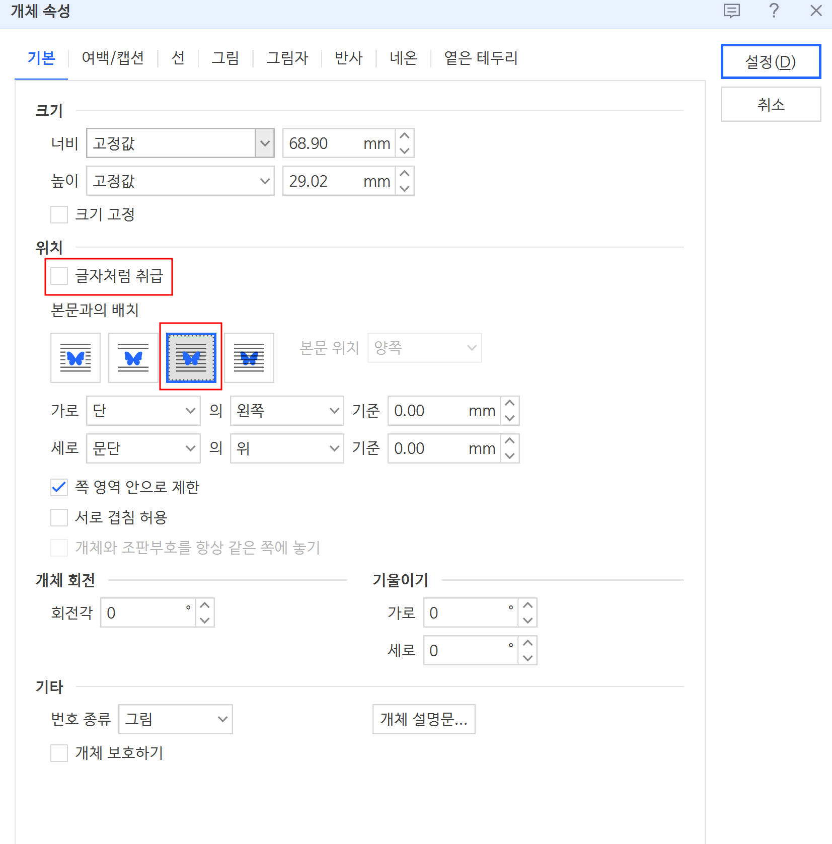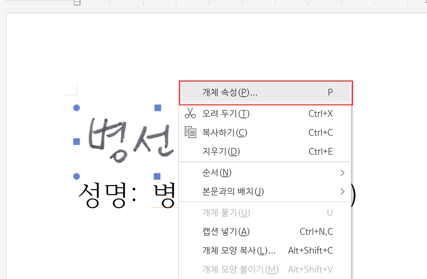 이후 입력한 서명 그림파일 위에서 마우스를 우클릭한 후 '개체속성'을 눌러줍니다.