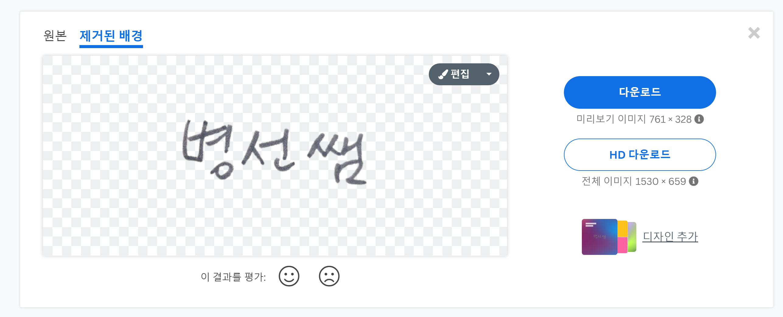 저장한 파일을 업로드하면, 자동으로 배경이 날아갑니다. (오)