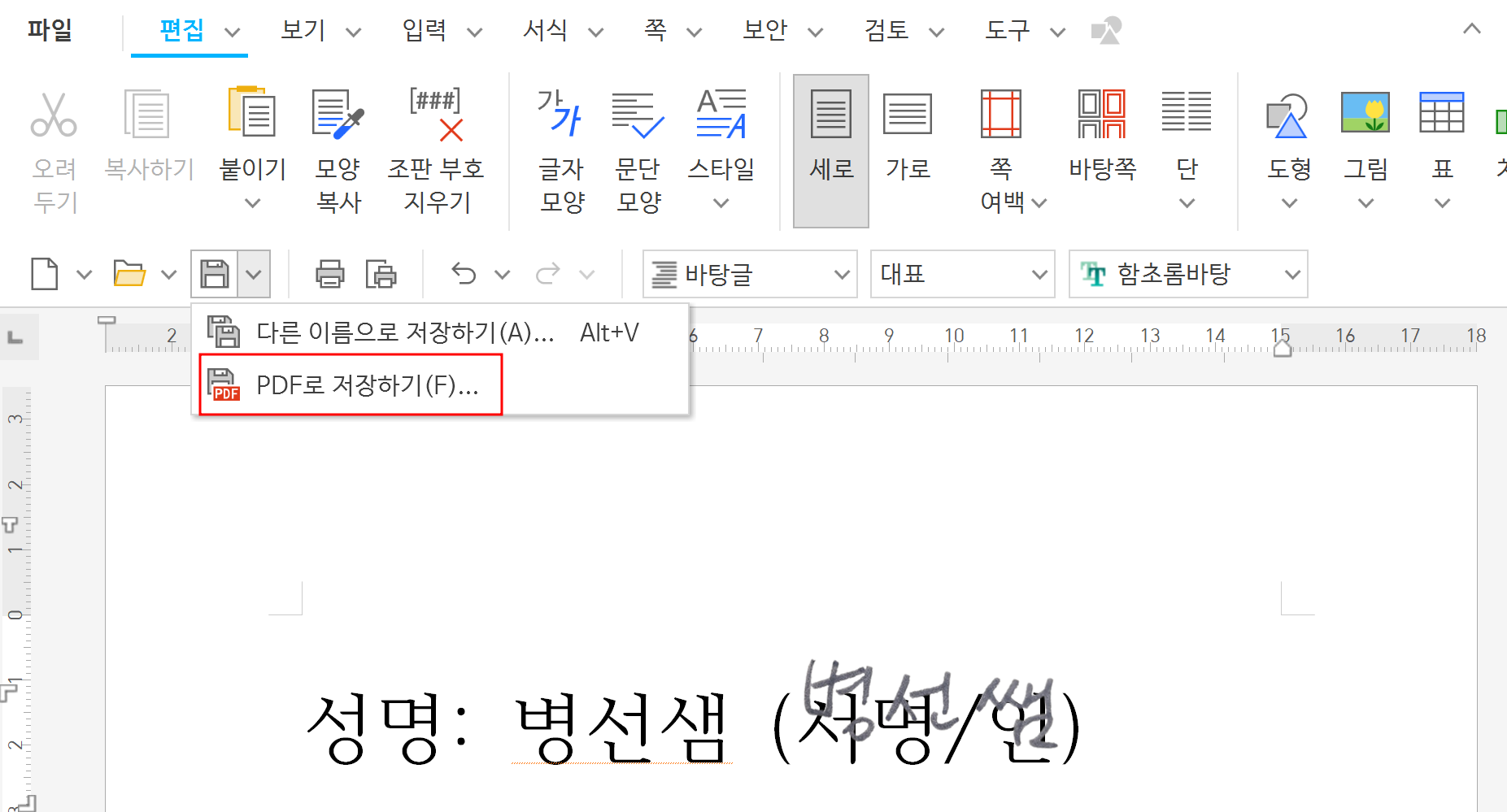 이후, PDF파일로 저장하면 감쪽같이 서명한 파일을 만들 수 있습니다.