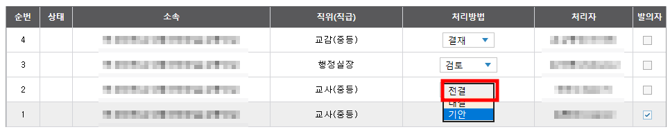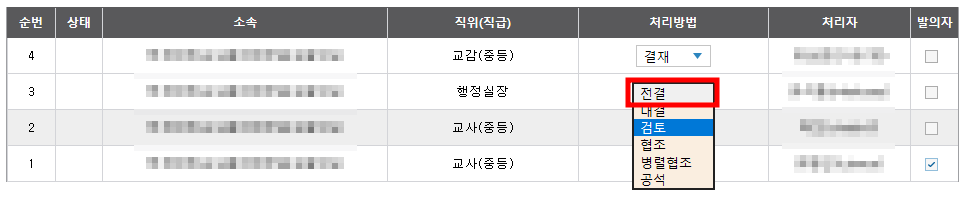 그 다음에는 그냥 3번, 4번에 넣으실 선생님들을 차례로 더블클릭하시면 전결이었던 처리방법이 자동으로 '검토'로 수정되게 됩니다.