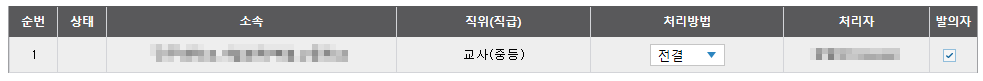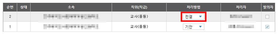 3번에 있는 분을 삭제하고 싶다. 그러면 2번 선생님께 '전결'을 넣으면 됩니다.