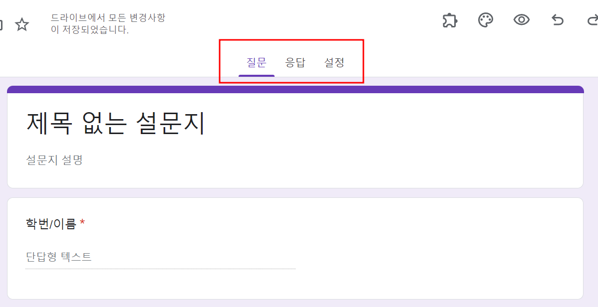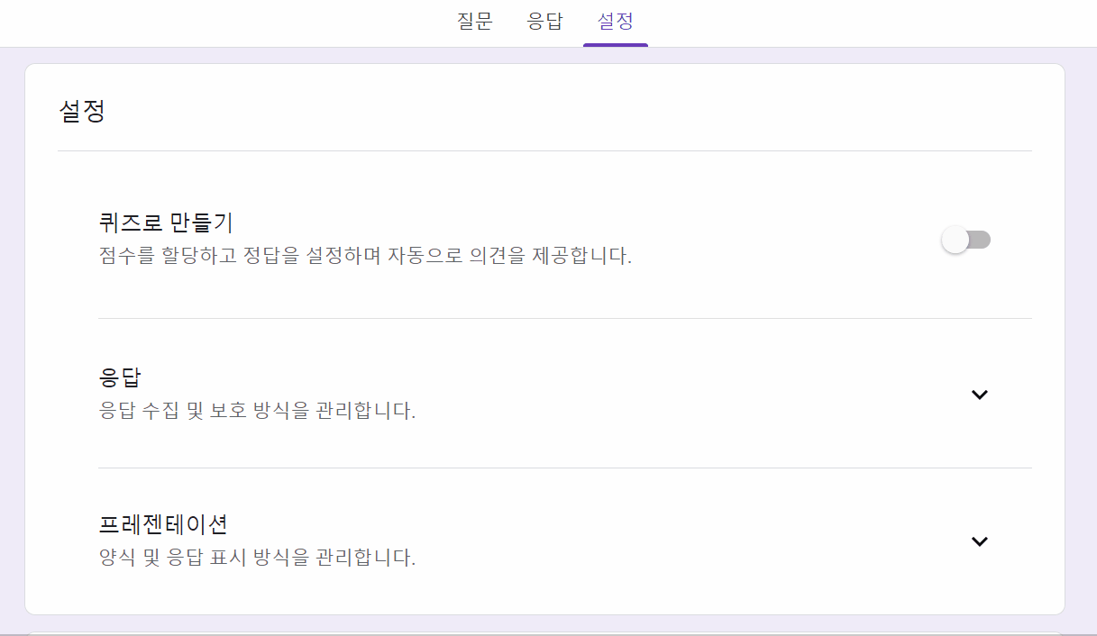 - 질문, 응답, 설정 탭 중에서 '설정'으로 이동합니다.