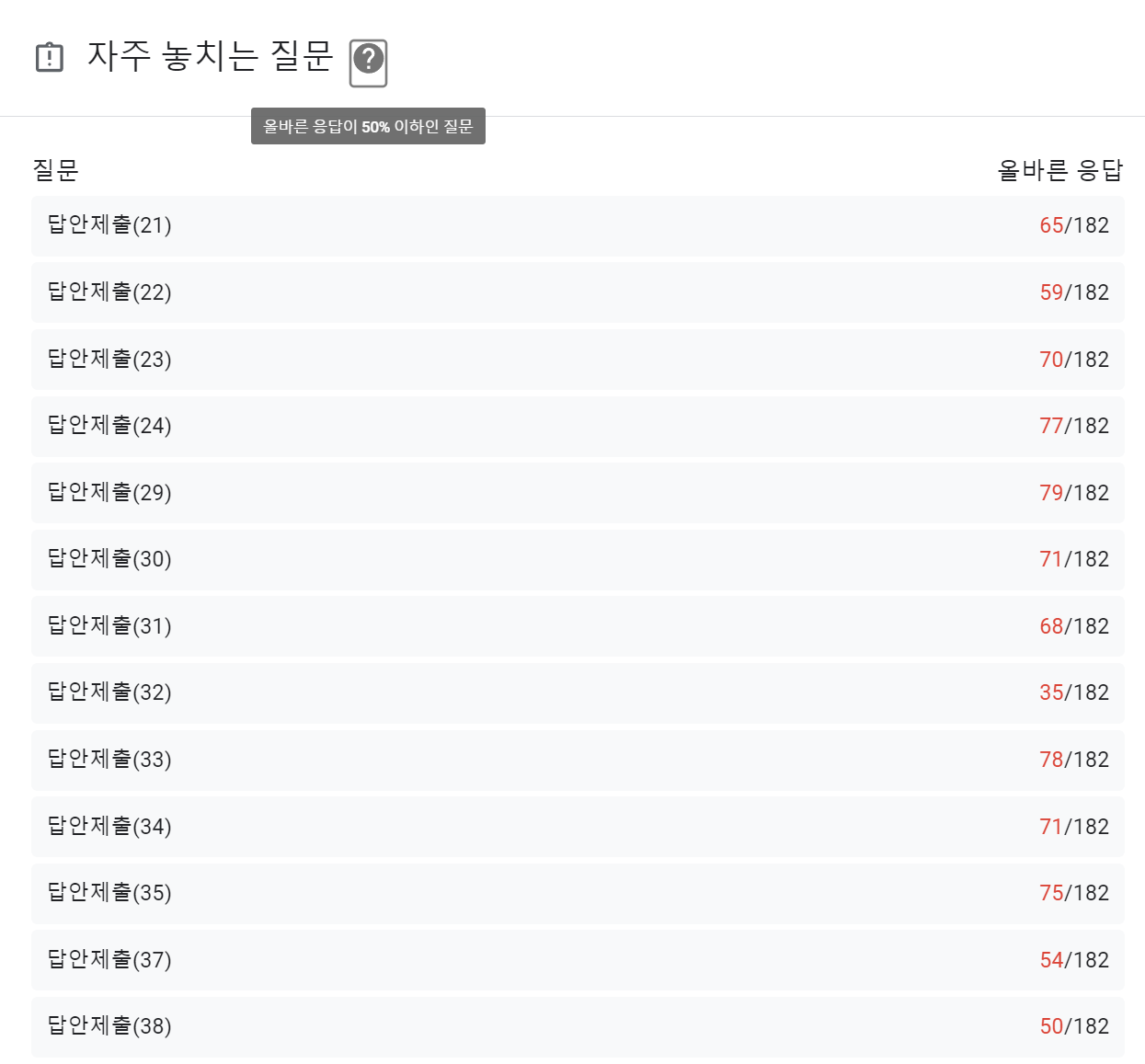 또한, 자주 놓치는 질문(올바른 응답이 50%이하인 질문)을 표시해줘, 학생들이 많이 틀린 문항들을 우선적으로 추려볼 수 있습니다.