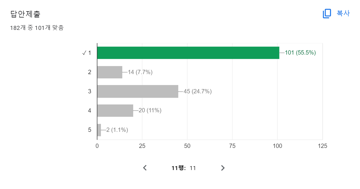 문제풀이 수업을 준비하며 가장 어려운 것은 학생들의 실제 체감이 어땠는가를 아는 것인데, 구글 설문지로 들어온 자료를 활용하면 문항별로 학생들이 선택한 선택지의 분포를 확인할 수 있어 문제풀이 해설강의를 준비하는데 아주 탁월한 자료로 활용할 수 있습니다.