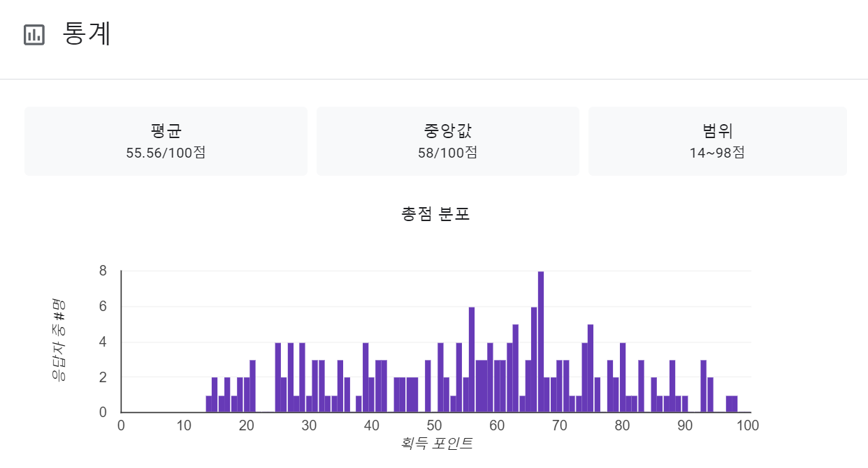 Google 설문지를 사용하면, 학생들이 5지선다 문제를 풀고 제출한 답변을 바로 확인할 수 있으며, 제출과 동시에 다양한 통계 자료를 얻을 수 있습니다.