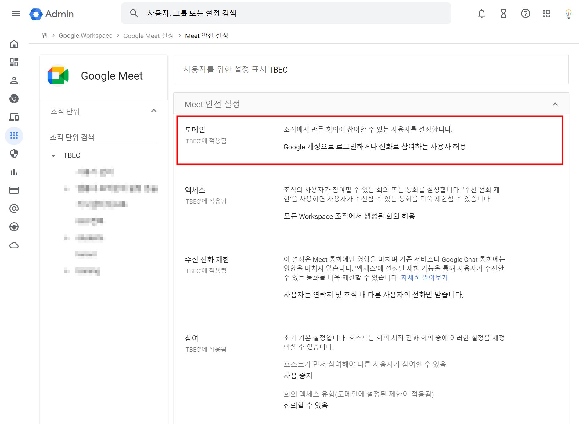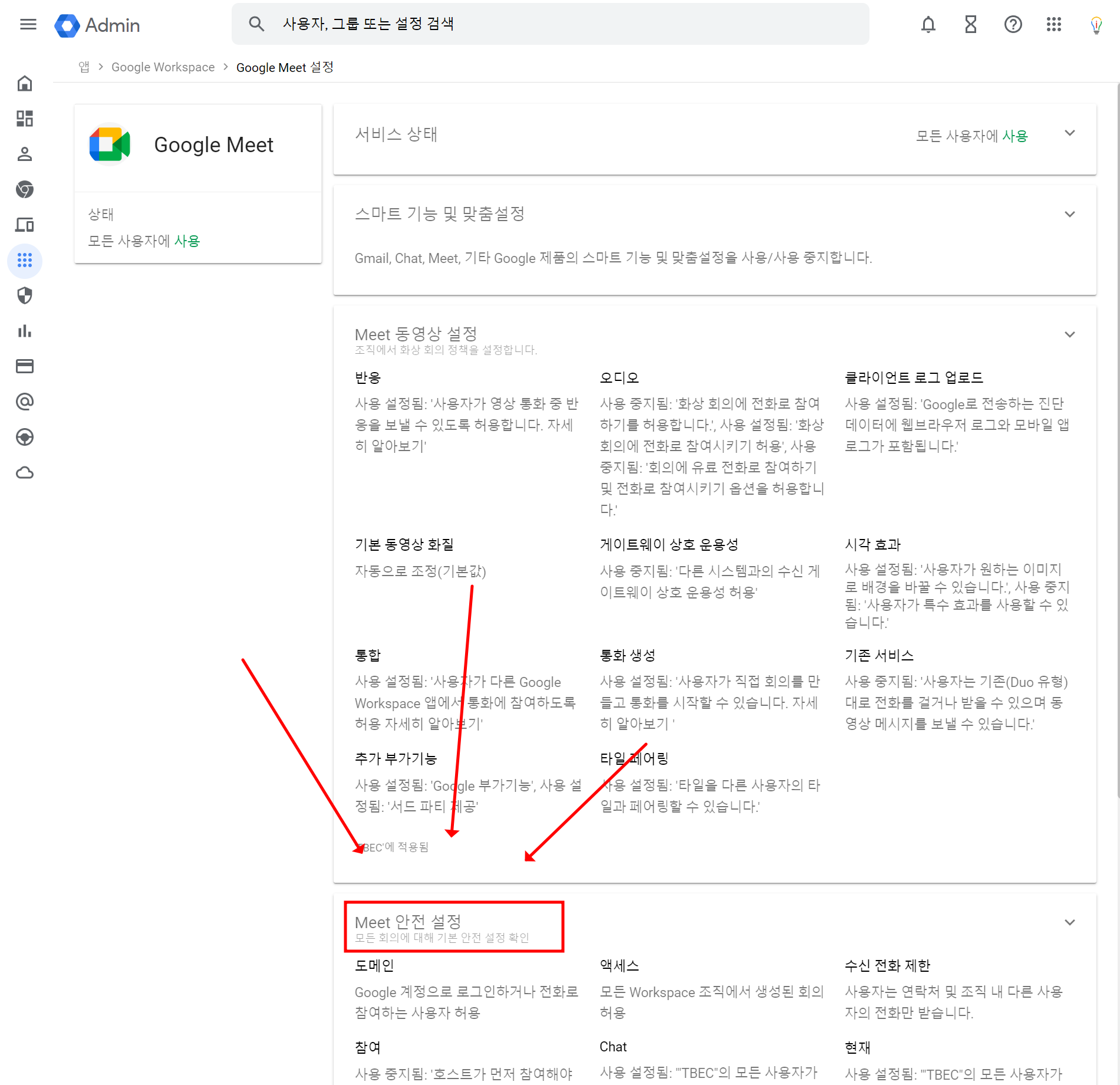 2. 설정화면 찾아가기: 앱 - Google Workspace - Google Meet - Meet 안전 설정
