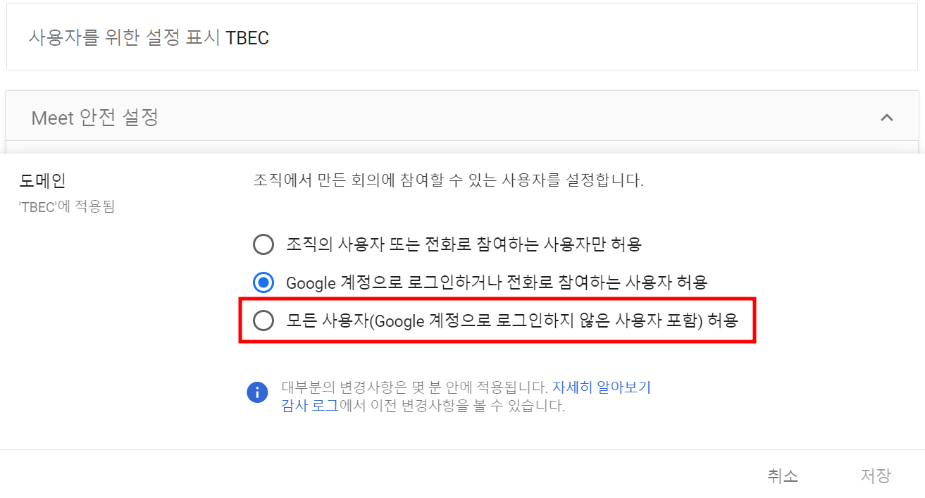 설정값을 '모든 사용자(Google 계정으로 로그인하지 않은 사용자 포함) 허용'으로 변경합니다.