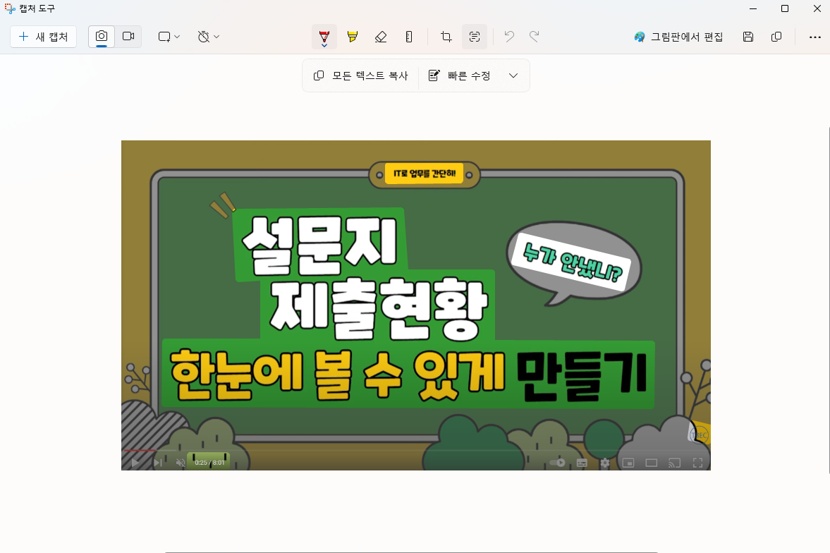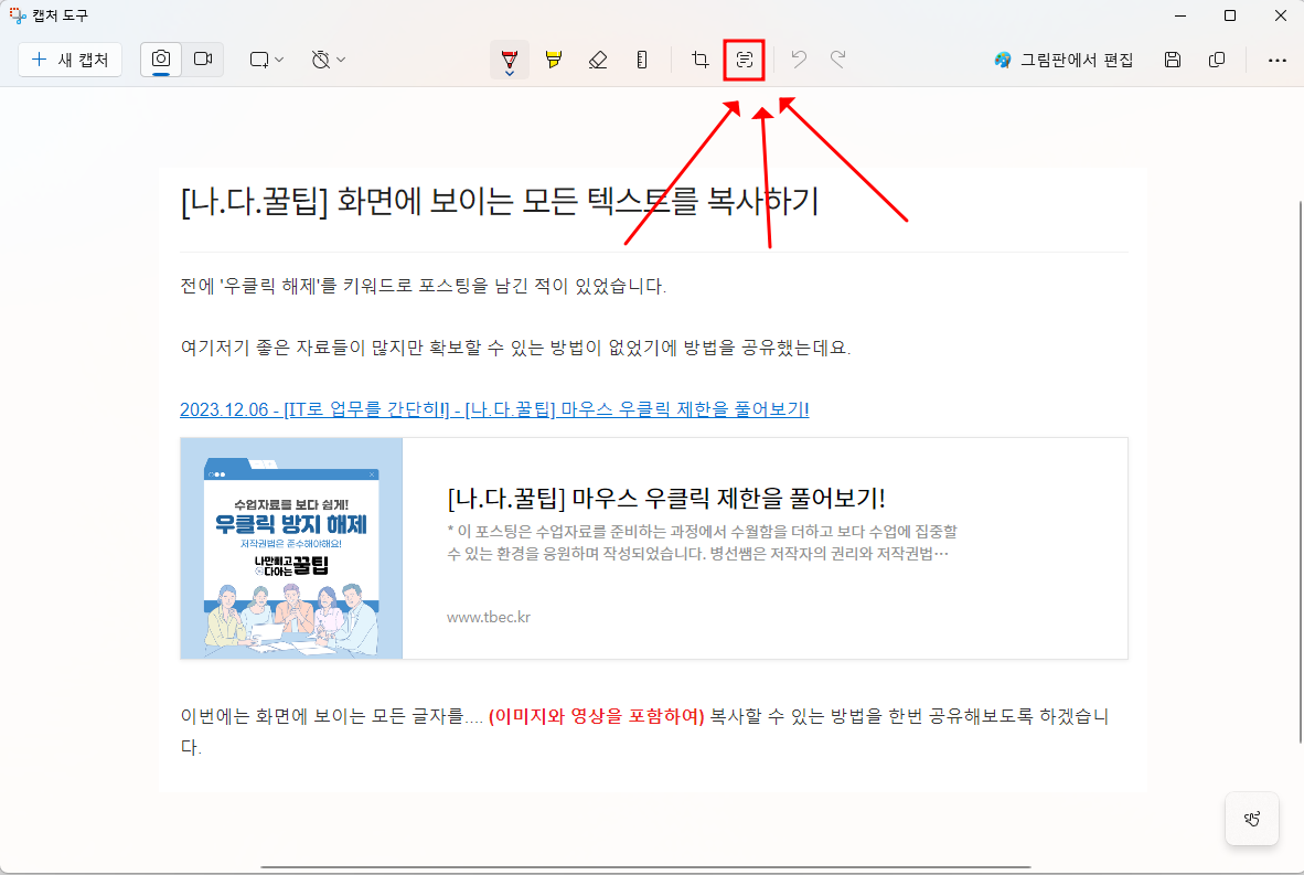 - 캡처도구 화면을 확인합니다. 이후 '텍스트 작업' 아이콘을 클릭합니다.