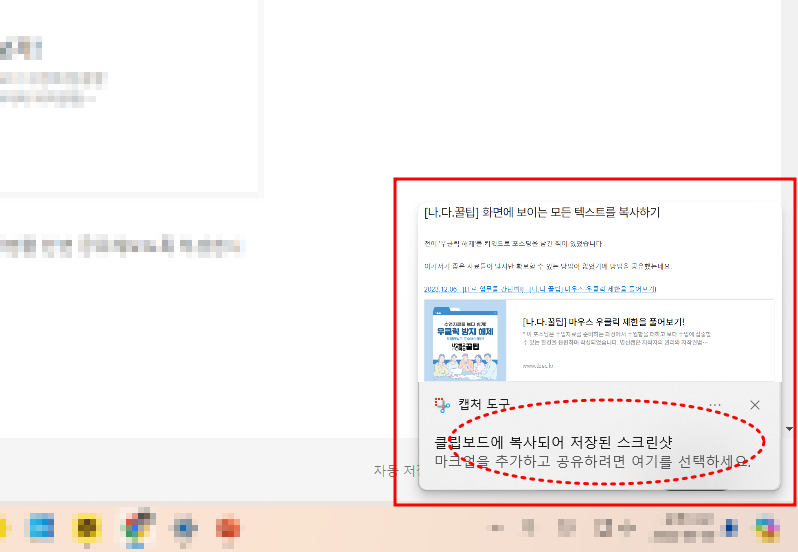 - 캡처 후 우측 하단에 뜨는 '캡처 도구' 알림을 클릭합니다.
