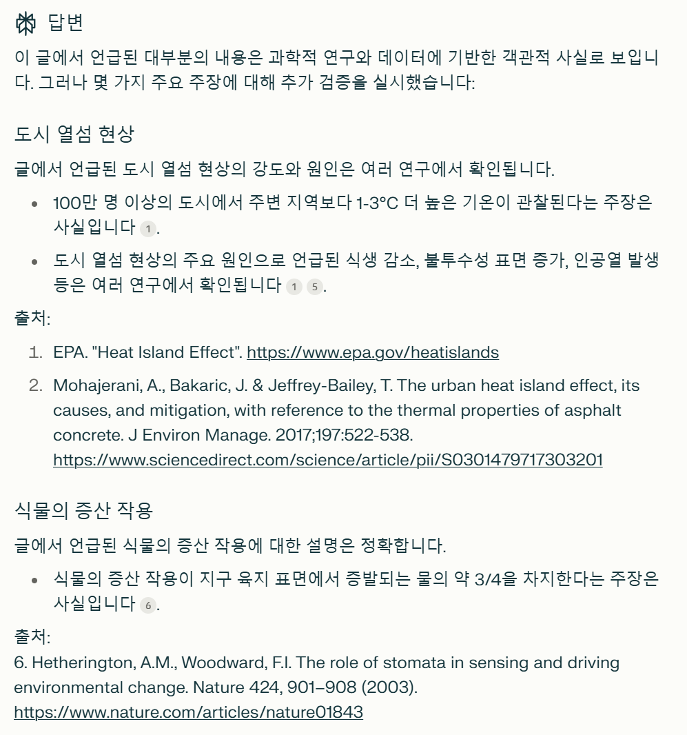 이 글에서 언급된 대부분의 내용은 과학적 연구와 데이터에 기반한 객관적 사실로 보입니다. 그러나 몇 가지 주요 주장에 대해 추가 검증을 실시했습니다: 도시 열섬 현상 글에서 언급된 도시 열섬 현상의 강도와 원인은 여러 연구에서 확인됩니다. 100만 명 이상의 도시에서 주변 지역보다 1-3°C 더 높은 기온이 관찰된다는 주장은 사실입니다1. 도시 열섬 현상의 주요 원인으로 언급된 식생 감소, 불투수성 표면 증가, 인공열 발생 등은 여러 연구에서 확인됩니다15. 출처: EPA. "Heat Island Effect". https://www.epa.gov/heatislands Mohajerani, A., Bakaric, J. & Jeffrey-Bailey, T. The urban heat island effect, its causes, and mitigation, with reference to the thermal properties of asphalt concrete. J Environ Manage. 2017;197:522-538. https://www.sciencedirect.com/science/article/pii/S0301479717303201 식물의 증산 작용 글에서 언급된 식물의 증산 작용에 대한 설명은 정확합니다. 식물의 증산 작용이 지구 육지 표면에서 증발되는 물의 약 3/4을 차지한다는 주장은 사실입니다6. 출처: 6. Hetherington, A.M., Woodward, F.I. The role of stomata in sensing and driving environmental change. Nature 424, 901–908 (2003). https://www.nature.com/articles/nature01843 해양 탄소 흡수 해양의 탄소 흡수에 대한 설명은 대체로 정확하지만, 일부 수치는 최신 연구와 약간의 차이가 있습니다. 해양이 연간 5-10 기가톤의 탄소를 흡수한다는 주장은 약간 과대평가된 것으로 보입니다. 최신 연구에 따르면 해양은 연간 약 2-3 기가톤의 탄소를 흡수합니다7. 출처: 7. Friedlingstein, P., et al. Global Carbon Budget 2020. Earth Syst. Sci. Data, 12, 3269–3340 (2020). https://essd.copernicus.org/articles/12/3269/2020/ 결론 전반적으로 글의 내용은 과학적 사실에 기반하고 있습니다. 일부 수치에서 약간의 차이가 있지만, 이는 최신 연구 결과와의 차이일 뿐 전체적인 논지에는 영향을 미치지 않습니다. 독자들은 이 글의 내용을 신뢰할 수 있지만, 과학은 계속 발전하므로 최신 연구 결과를 참고하는 것이 좋습니다.