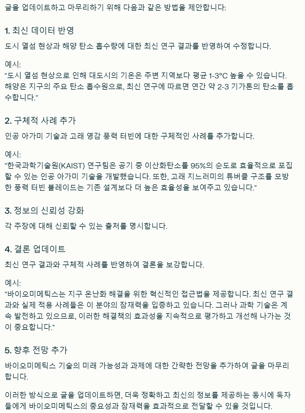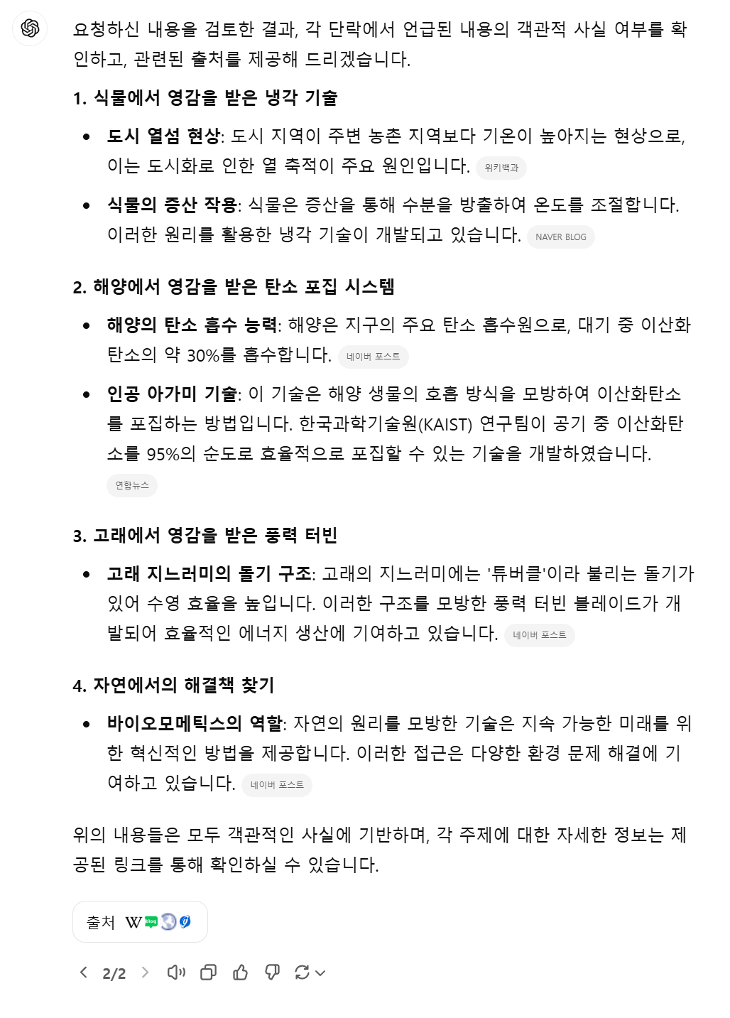 요청하신 내용을 검토한 결과, 각 단락에서 언급된 내용의 객관적 사실 여부를 확인하고, 관련된 출처를 제공해 드리겠습니다. 1. 식물에서 영감을 받은 냉각 기술 도시 열섬 현상: 도시 지역이 주변 농촌 지역보다 기온이 높아지는 현상으로, 이는 도시화로 인한 열 축적이 주요 원인입니다. 위키백과 식물의 증산 작용: 식물은 증산을 통해 수분을 방출하여 온도를 조절합니다. 이러한 원리를 활용한 냉각 기술이 개발되고 있습니다. NAVER BLOG 2. 해양에서 영감을 받은 탄소 포집 시스템 해양의 탄소 흡수 능력: 해양은 지구의 주요 탄소 흡수원으로, 대기 중 이산화탄소의 약 30%를 흡수합니다. 네이버 포스트 인공 아가미 기술: 이 기술은 해양 생물의 호흡 방식을 모방하여 이산화탄소를 포집하는 방법입니다. 한국과학기술원(KAIST) 연구팀이 공기 중 이산화탄소를 95%의 순도로 효율적으로 포집할 수 있는 기술을 개발하였습니다. 연합뉴스 3. 고래에서 영감을 받은 풍력 터빈 고래 지느러미의 돌기 구조: 고래의 지느러미에는 '튜버클'이라 불리는 돌기가 있어 수영 효율을 높입니다. 이러한 구조를 모방한 풍력 터빈 블레이드가 개발되어 효율적인 에너지 생산에 기여하고 있습니다. 네이버 포스트 4. 자연에서의 해결책 찾기 바이오모메틱스의 역할: 자연의 원리를 모방한 기술은 지속 가능한 미래를 위한 혁신적인 방법을 제공합니다. 이러한 접근은 다양한 환경 문제 해결에 기여하고 있습니다. 네이버 포스트 위의 내용들은 모두 객관적인 사실에 기반하며, 각 주제에 대한 자세한 정보는 제공된 링크를 통해 확인하실 수 있습니다.