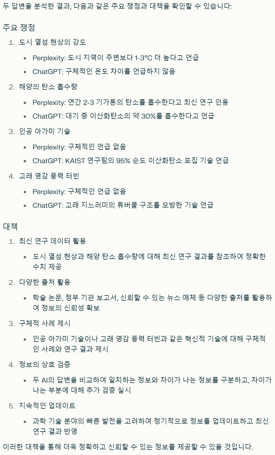 프롬프트: 위 답변은 perplexity에서 내놓은 답변이야. / 아래는 Chat GPT에서 내놓은 답변이야. / 두 내용을 분석해서 쟁점을 출력하고 대책을 알려줘.