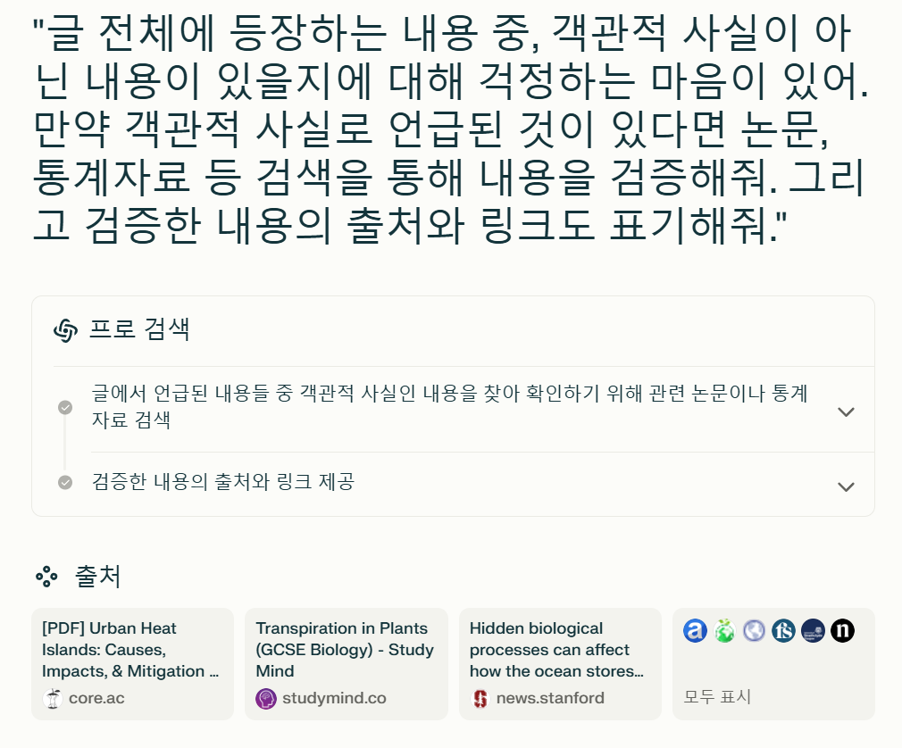 이러한 경우 다시 생성형 인공지능을 통해 사실을 확인해볼 수 있는데 다음과 같은 프롬프트를 사용할 수 있습니다.