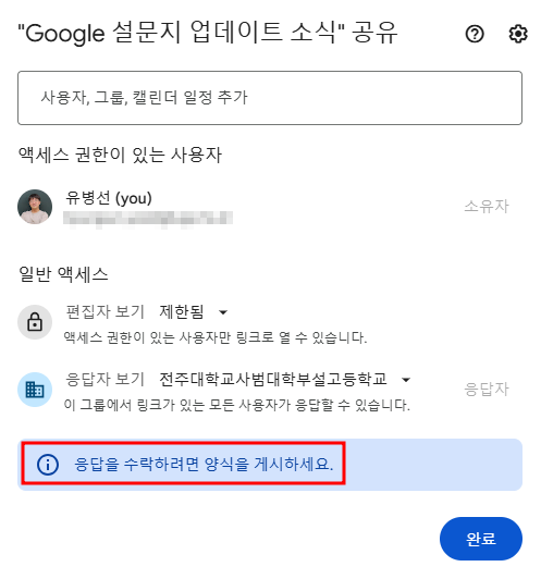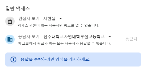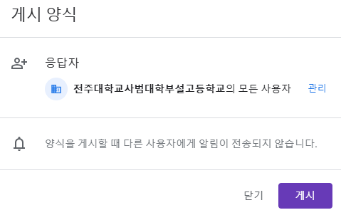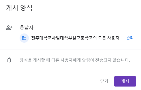 - '게시' 버튼을 눌렀을 때 설정할 수 있는 내용은 '응답자'의 범위입니다.