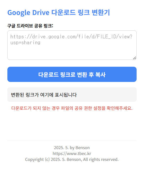 공유 링크를 생성 후 해당 프로그램에 붙여넣고 '다운로드 링크로 변환 후 복사' 버튼을 누르면 다운로드 링크가 생성될 수 있도록 구성해봤습니다.