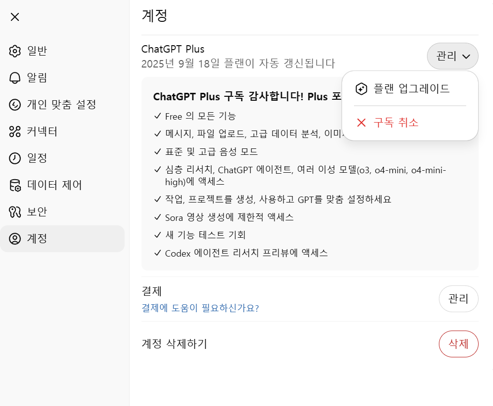 - '관리' 버튼을 누른 후 '구독 취소' 버튼을 눌러줍니다.